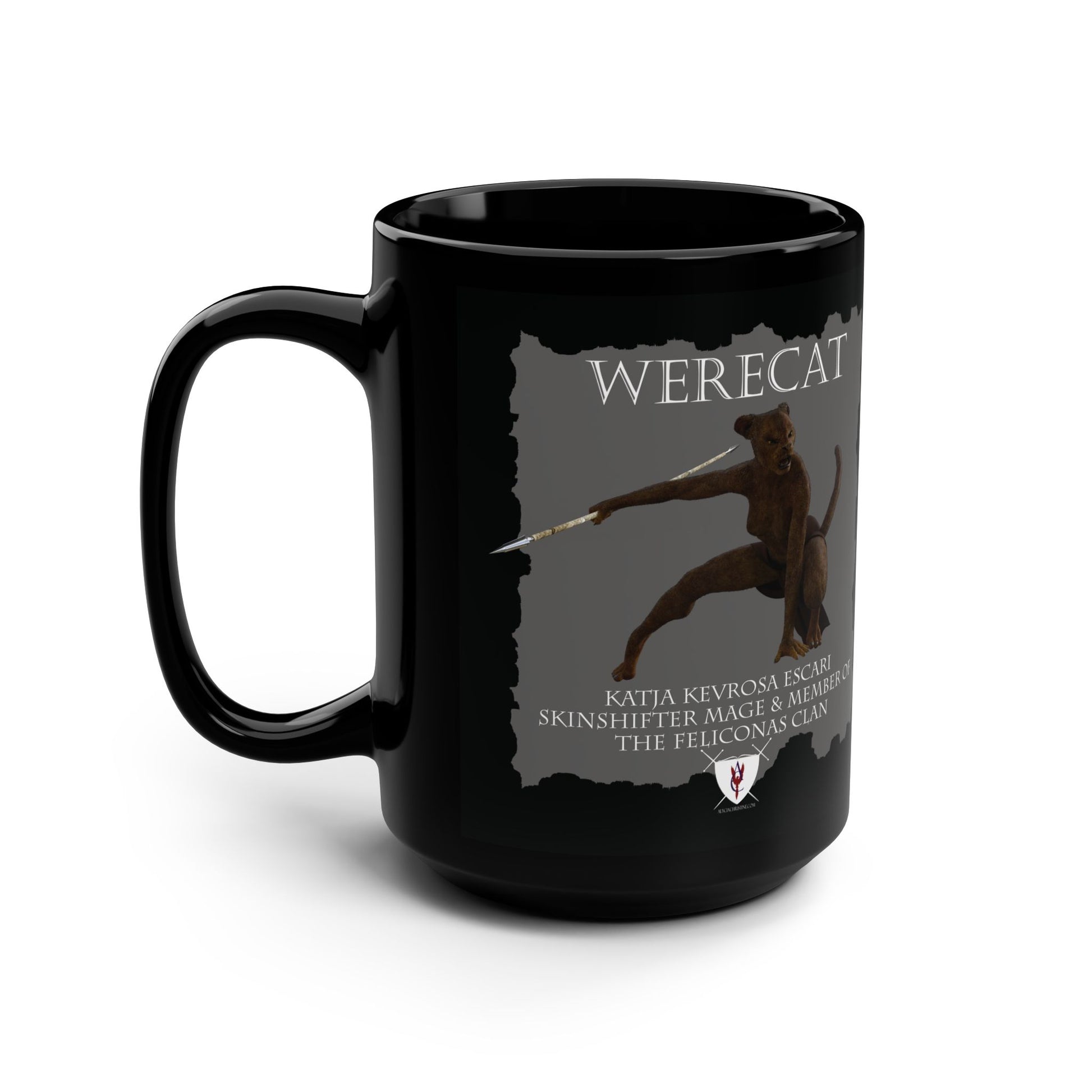 "Crouching Werecat Katja" and "Feliconas Clan Crest" 15 oz. Mug