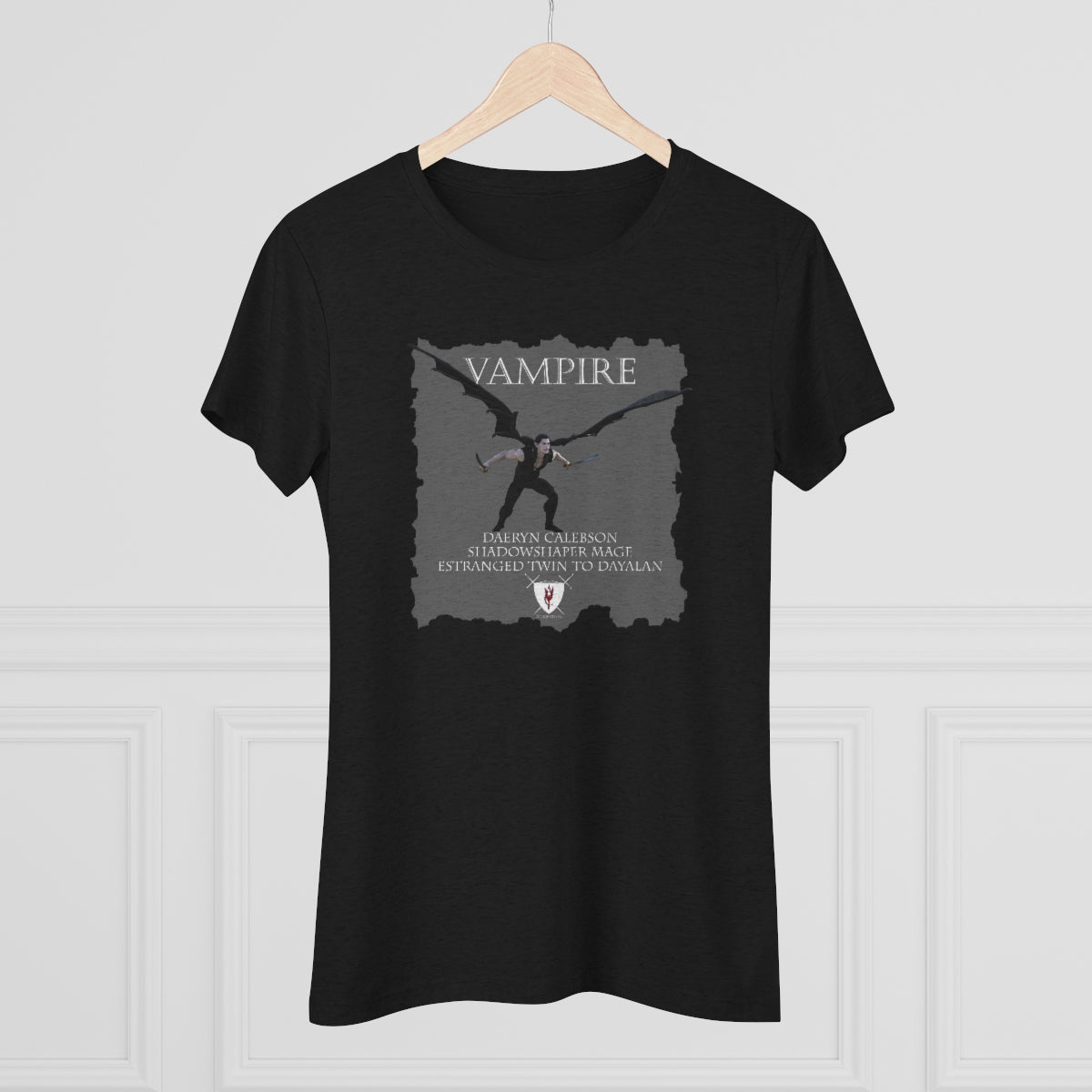 This incredibly soft and perfect fit t-shirt boasts the "Vampire Daeryn" design on the front and the "Throne and Stone" design on the back. Made of a triple fabric blend, it offers long-lasting beauty and style.